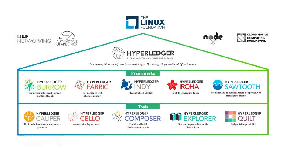 上边五个是框架类项目,包含大家比较熟悉的 Fabric,还有比如 Burrow,是 Hyperledger 中第一个支持以太坊智能合约的许可链技术。Indy 是一个分布式身份的区块链框架。Iroha 是一个来自日本的区块链项目,而 Sawtooth 是 Intel 贡献的,也是继 Fabric 之后,第二个从 Hyperledger 孵化项目中毕业的。