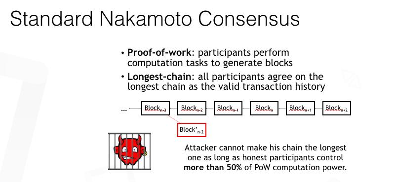 我们先来简单的看一下比特币中的共识机制是如何工作的。在这个协议里面,交易是被打包到区块里面的。所有的区块形成了一个链,这个链表示了交易的历史纪录。每一个参与这个协议的机器节点都会想要去产生一个新的区块并在该区块里打包新的交易,并且通过将前一个区块的哈希值存入新区块的头部信息来将新区快链在区块链的尾部。这个协议通过使用工作量证明以及最长链规则来让所有的机器节点对区块链的状态达成共识。同时,它维持了一个很慢的全网的平均出块率以及相对较小的区块大小。