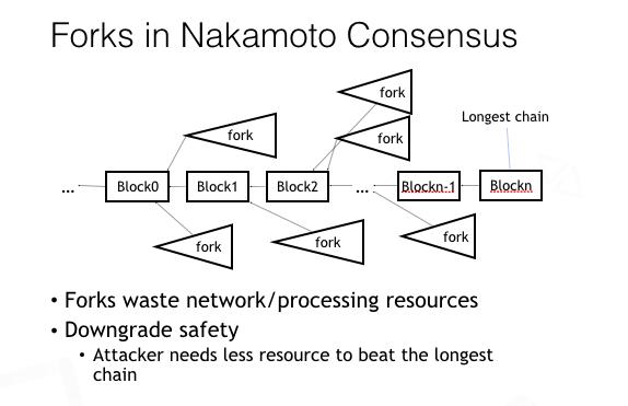 这带来两个问题。第一,这些分叉浪费了网络和计算资源,因为只有最长链中的区块才被认为是有效的。第二,它危害了安全性,因为整个区块链里的最长链变短了,这使得攻击者只需要少于50%的算力就可以产生出恶意的最长链了。