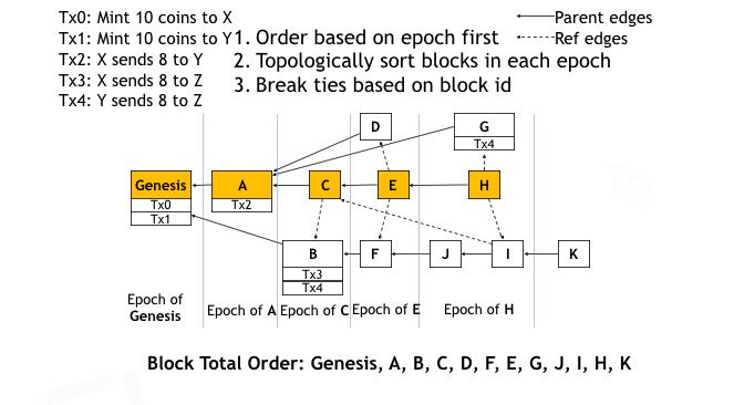 现在我们有了让所有机器节点对主链产生共识的机制。那接下来,这些节点如何对区块的全序达成共识呢?为了做到这一点,我们引入一个Epoch的概念。在主链上的每一个区块就确定了一个Epoch。在分叉上的区块属于哪个Epoch,是由第一个产生在它之后的主链区块所在的Epoch决定的。比如,区块D属于Epoch E,因为D最先被E引用,所以产生在E之前,但是D并不产生在C之前。