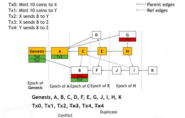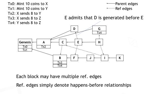 接下来我们用一个具体的例子来说明这个想法。假设这个图上显示的是Conflux的账本在某一时刻的状态。每个区块都有一个指向它的父亲区块的parent边。那么这些区块和它们的parent边,就构成了一个树形结构。除了指向父亲的边以外,每一个区块还可以有多个引用边。这个引用边主要是记录和表达区块之间的happens-before关系。比如,如果一个机器节点在产生区块E的时候,它已经有了区块D,而且这个时候,D也没有任何一个其他区块引用了它。那么这个节点可以给E加上一个引用D的边来表示D是在E之前产生的。