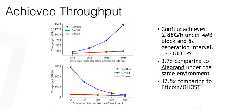 这个蓝色线是Conflux,可以看到区块越大、出块率越高,Conflux的吞吐率就可以线性的增加,但是比特币和Ghost就做不到。这是因为这时比特币和Ghost的区块利用率会大幅下降。