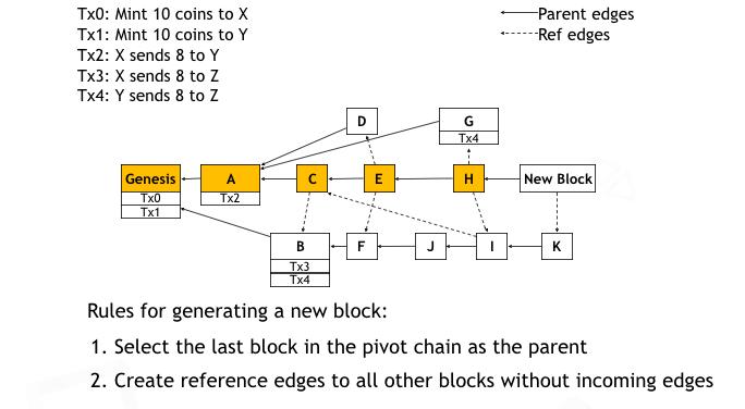 为了产生一个新的区块,一个机器节点首先选择主链上的最后一个区块作为新区块的父亲,然后这个新区块再把所有已经收到但还没有被其他区块所引用的区块引用起来。