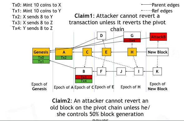 那么接下来一个问题是Conflux如何能够防止双花攻击。我们首先来看一下一个攻击者如何能够逆转在账本中的一个交易,比如交易4。为了做到这一点,一个攻击者需要产生一个交易4的双花交易,打包到一个区块里面,并且将这个区块在区块的全序中插入到区块B的前面。但攻击者很难做到这一点,主要有两个原因。第一个就是除非攻击者能够改变主链,不然他不能够逆转交易,因为交易的顺序是由主链来决定的。比如一个攻击者想把一个块插在靠前的位置,他能做就是在一个很早的Epoch里面的区块后面接着产生新块。但是只要这个块不在主链上,它就最终还是会属于一个很晚的Epoch。因为当一个诚实的新块产生以后,它会通过引用边把这个攻击者的区块给拉到新的Epoch里面。