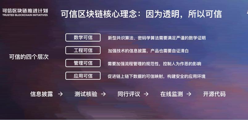为了促进整个行业的理性健康发展,我们倡导 “因为透明,所以可信” 的原则。这里的可信,包含四个层次:数学可信、工程可信、管理可信和应用可信。只有做到信任机制的环环相扣,才能打消大家的疑问。