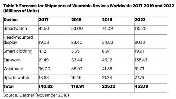 在 Gartner 看来,尽管到了 2022 年,智能手表的出货量可以达到 1.152 亿台,但它可能比不过届时的耳机类可穿戴设备,后者预计有望达到 1.58 亿台的出货量,并挤下智能手表成为可穿戴设备市场的主导地位,达到整个可穿戴设备市场 30% 以上的份额。