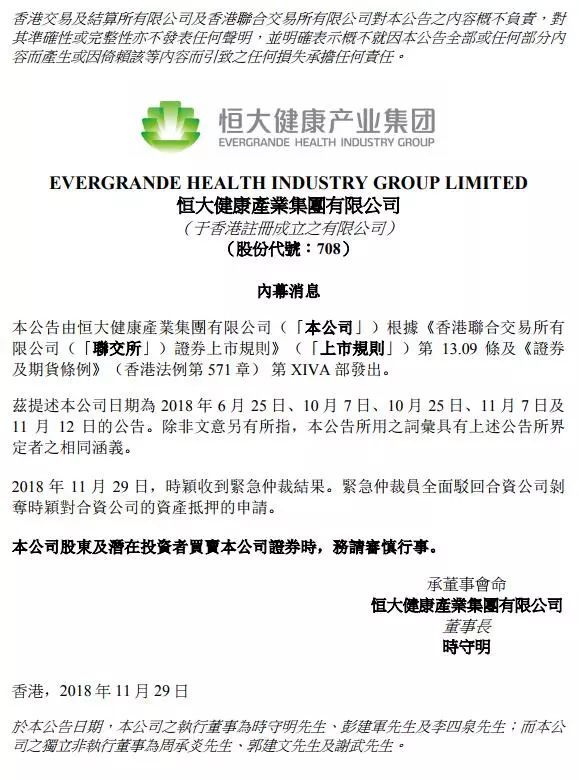 11月29日晚间,恒大健康发布公告,时颖收到紧急仲裁结:紧急仲裁员全面驳回合资公司剥夺时颖对合资公司的资产抵押的申请。
