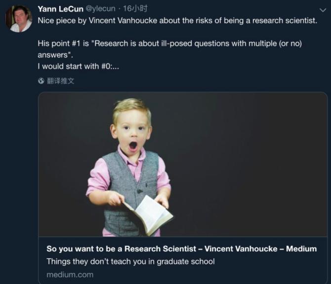 作为 Vincent 的同行,人工智能先驱,FAIR 负责人 Yann LeCun 看到这篇文章之后表示非常赞同:成为研究科学家有风险。同时他也在九条之前加上了一条第零规则:研究是为了制定更好的问题。