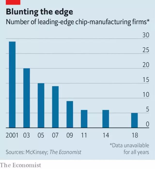 据咨询公司麦肯锡(McKinsey)称,2001年有29家公司提供最先进的晶圆厂设施,但今天只有五个。这些晶圆厂由美国、台湾和韩国的公司所有,中国在这方面并不占优势。