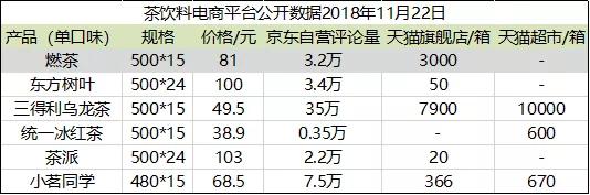 电商平台数据说明:1)采集该品牌最畅销口味数据 2)京东不显示销量,取评论量参考;评论数量自产品上线后累计,燃茶上线时间晚于其他品牌 3)天猫平台为月销量,平台SKU调整22日未搜到部分实时数据