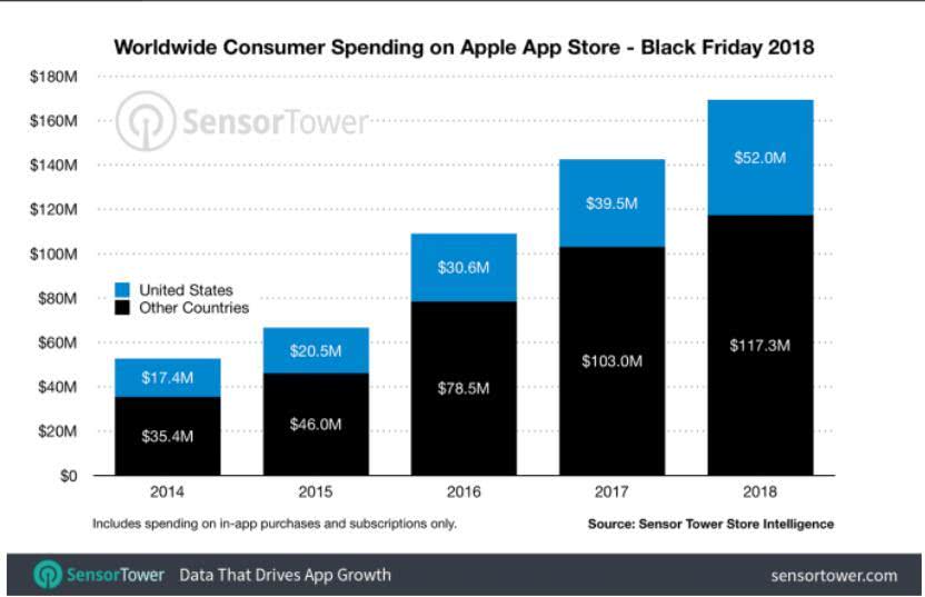 Sensor Tower公司发现,在黑色星期五,美国境外的苹果App Store用户支出了1.173亿美元,将App Store全球用户支出总额推高到了1.693亿美元,较2017年增长了18.4%。美国境外的支出额同比增长了13.9%,但是美国境内支出额同比增长了31.6%。
