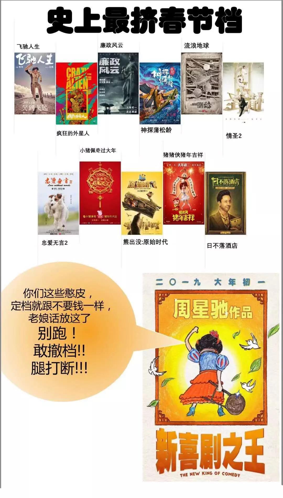 除去《新喜剧之王》,还有宁浩导演,黄渤、沈腾主演的《疯狂的外星人》;成龙、阮经天领衔的《神探蒲松龄》;韩寒导演、沈腾等主演的《飞驰人生》;2017年小成本爆款的续集,吴秀波、白百何、肖央主演的《情圣2》;大刘(刘慈欣)同名小说改编、吴京主演的《流浪地球》;开心麻花的《日不落酒店》;刘青云、张家辉联手的《廉政风云》;在全球都算顶级IP的小猪佩奇开发的影片《小猪佩奇过大年》;今年收获了6亿票房的“熊出没”系列的第6部;最不济的,也是曾志伟领衔的《八戒传说》。