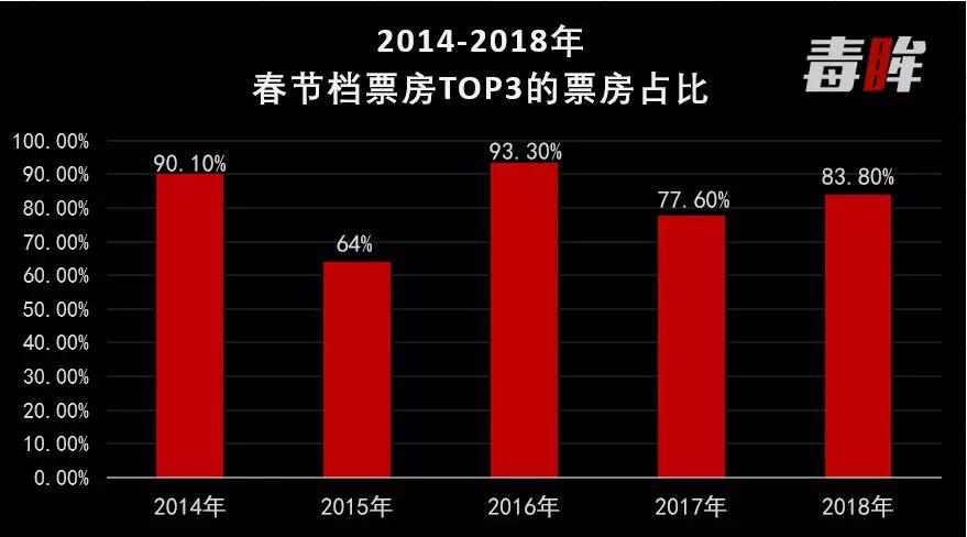 从这五年的春节档来看,2014年前三名7天内票房占比为90.1%;2015年这一数字为64%,是近五年来的最低值;2016年为93.3%,其中《美人鱼》单片档期票房占比接近50%;2017年前三票房占比为77.6%;今年春节档票房前三占比83.8%——我不得不提出一个悲观的假设:这13部影片如果都不撤档,至少有7部影片在春节期间拿不到他们想要的成绩。