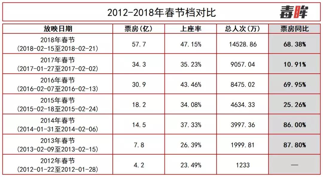 2018年春节档7天57亿,同比增长超过68%的爆炸票房给电影市场吃了一记春药,7天内三部影片超过10亿,5部影片超过3亿,即便口碑最差、豆瓣评分仅4.3的《祖宗十九代》都在七天内拿了9000万票房。