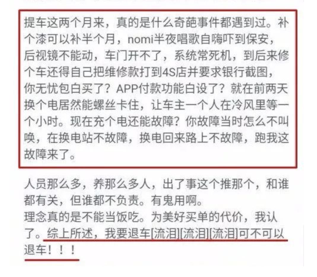 除高管离职外,近日,蔚来出现了首位要求退车用户。一位ES8车主发文称,“提车两个月,真的是什么奇葩事件都遇到过,补个漆可以补半个月,车载机器人Nomi半夜唱歌自嗨,吓到保安”。对此,该车主要求退车。