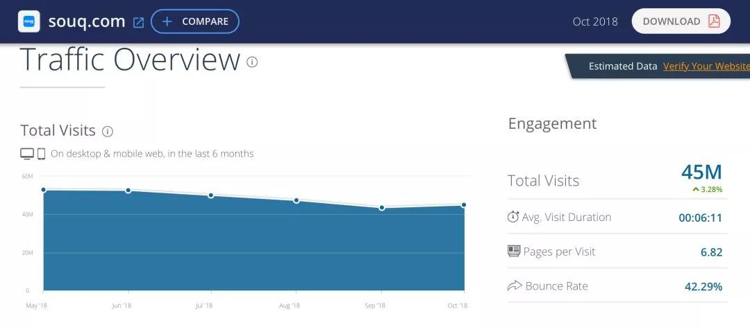 Souq在2018年10月份的月访问量已经达到4500万,单用户访问时长6分钟。自2018年5月开始到10月,Souq的访问量很稳定,可以推断Souq的访问量中自然流量占比非常高。