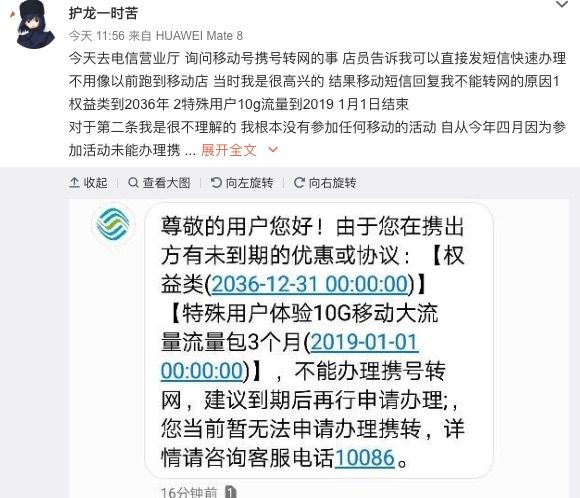 ▲ 微博上有不少用户反映,短信查询后发现自己无法办理携号转网服务,因为一些运营商活动未到期
