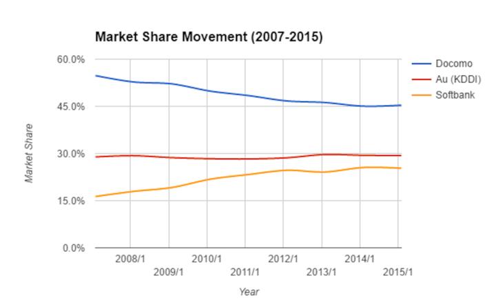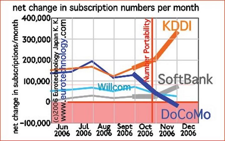 仅仅是开始后的 2 个月,日本运营商市场格局就发生了明显变化,当时的的领先者 NTT DoCoMo 遭遇自成立以来的第一次用户数下跌,而最大的赢家无疑是落后的 au 和 SoftBank。