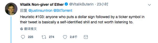 因此,针对孙宇晨的评论,V 神发推进行了回应,称无论是谁发布推特时,在交易代码前添加美元符号,这些人都是不值得被倾听的。