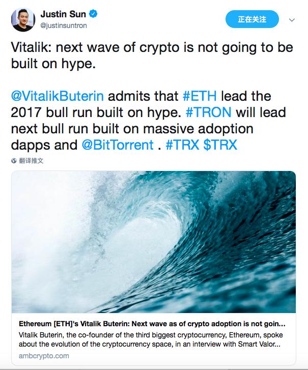 对于这一报道,波场的创始人孙宇晨此前转发相关的报道并评论称,“V 神承认 ETH 在炒作的基础上引领了 2017 年的牛市,TRON 则将在大规模采用 DApp 和 BitTorrent 的基础上引领下一轮牛市”,并在该推文最后的话题标签里添加了美元符号和 TRX。