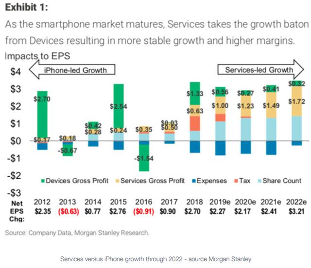 报告显示,随着服务业在增量利润中占据更大份额,未来几年的利润走势会更好。从下图中可以看出,2012年至2018年,苹果的增量利润出现了大幅波动。然而,从2019年开始,利润增长变得更加稳定。这一增长在很大程度上要归功于服务业。据估计,该行业2018年的毛利润增量仅为0.63美元,但到2022年,每股收益增量将达到1.72美元。