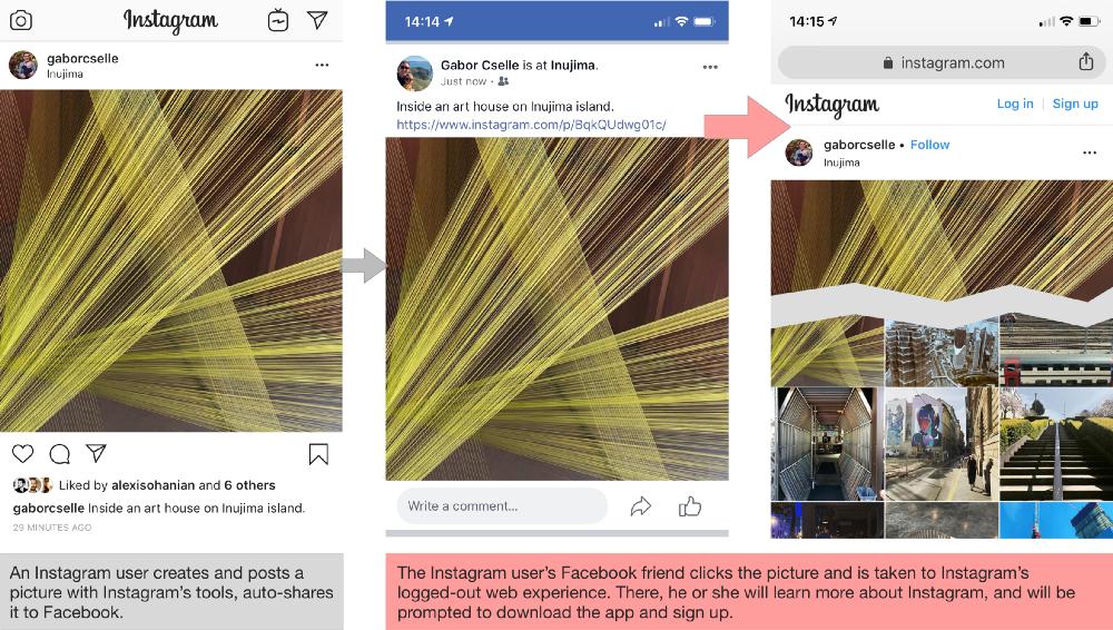 Instagram最初是为了将蹩脚的智能手机摄像头拍摄出来的东西变成好看的相片。这些相片往往会自动分享到Facebook或者Twitter上,然后再链接回Instagram。如果你看到某人的漂亮照片之后,就会好奇他是怎么做到的,然后反过来就会下载Instagram。