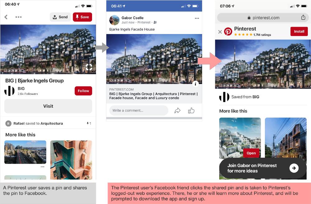 Pinterest允许用户直接贴(pin)web上的东西,然后再把它分享到Facebook上。这种方式有奇效。当某人发现Pin的东西时,他们就会点击那东西进入Pinterest,从而看到更多更有趣的东西,迅速陷入到维基百科式的浏览黑洞里面。