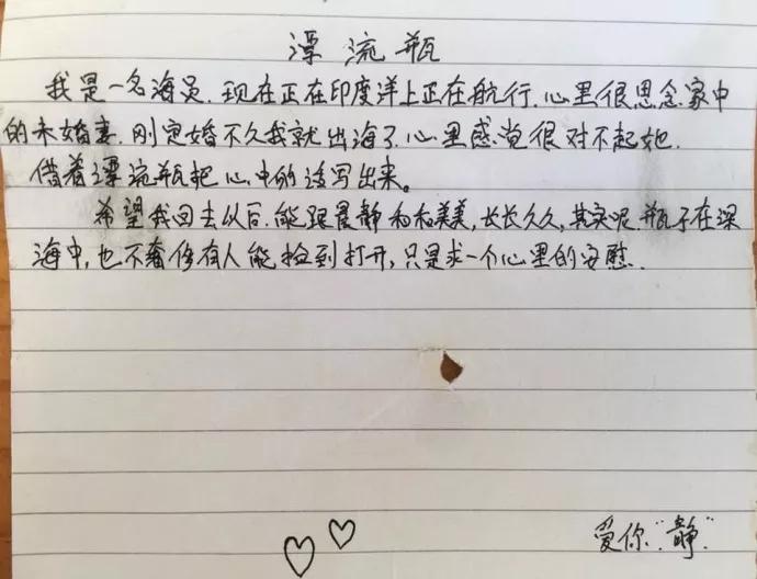 “我是一名海员,现在正在印度洋上正在航行,心里很思念家中的未婚妻。刚订婚不久,我就出海了,心里感觉很对不起她。”这段文字出现在一个真实的漂流瓶里。