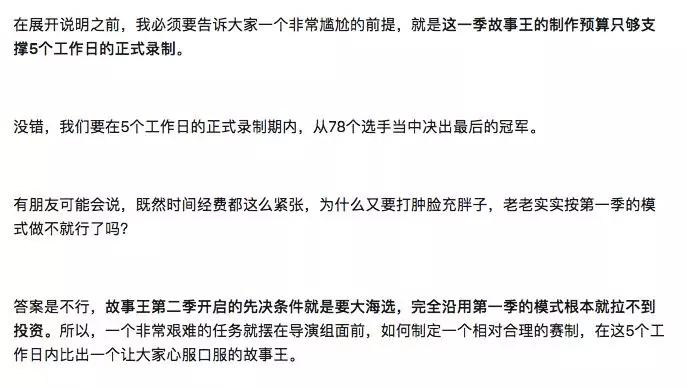 与所有竞技真人秀一样,赛制的设置都是头疼的问题,《故事王》第二季导演王吕叉曾在知乎问答中介绍过,节目的正式录制期只有5个工作日,但却需要从78个选手当中决出最后的冠军。