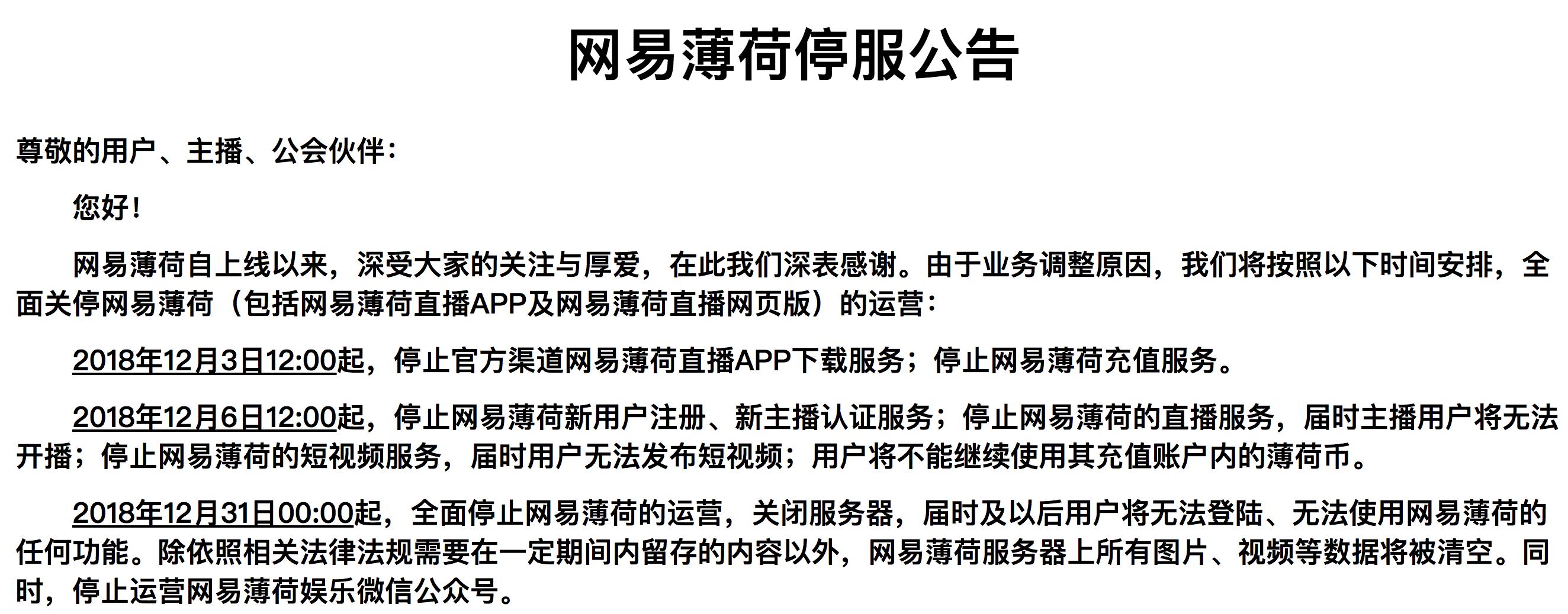 2018年12月3日12:00起,停止官方渠道网易薄荷直播App下载服务和充值服务;2018年12月6日12:00起,停止网易薄荷新用户、新主播的认证服务;停止网易薄荷的直播、短视频服务;2018年12月31日00:00起,全面停止网易薄荷的运营,关闭服务器。