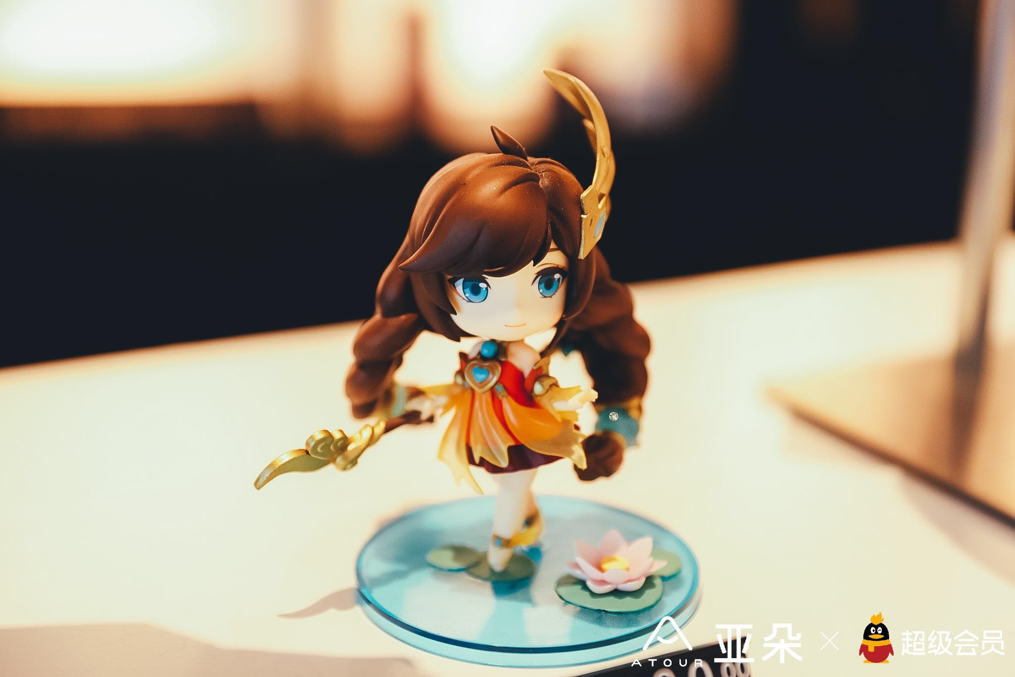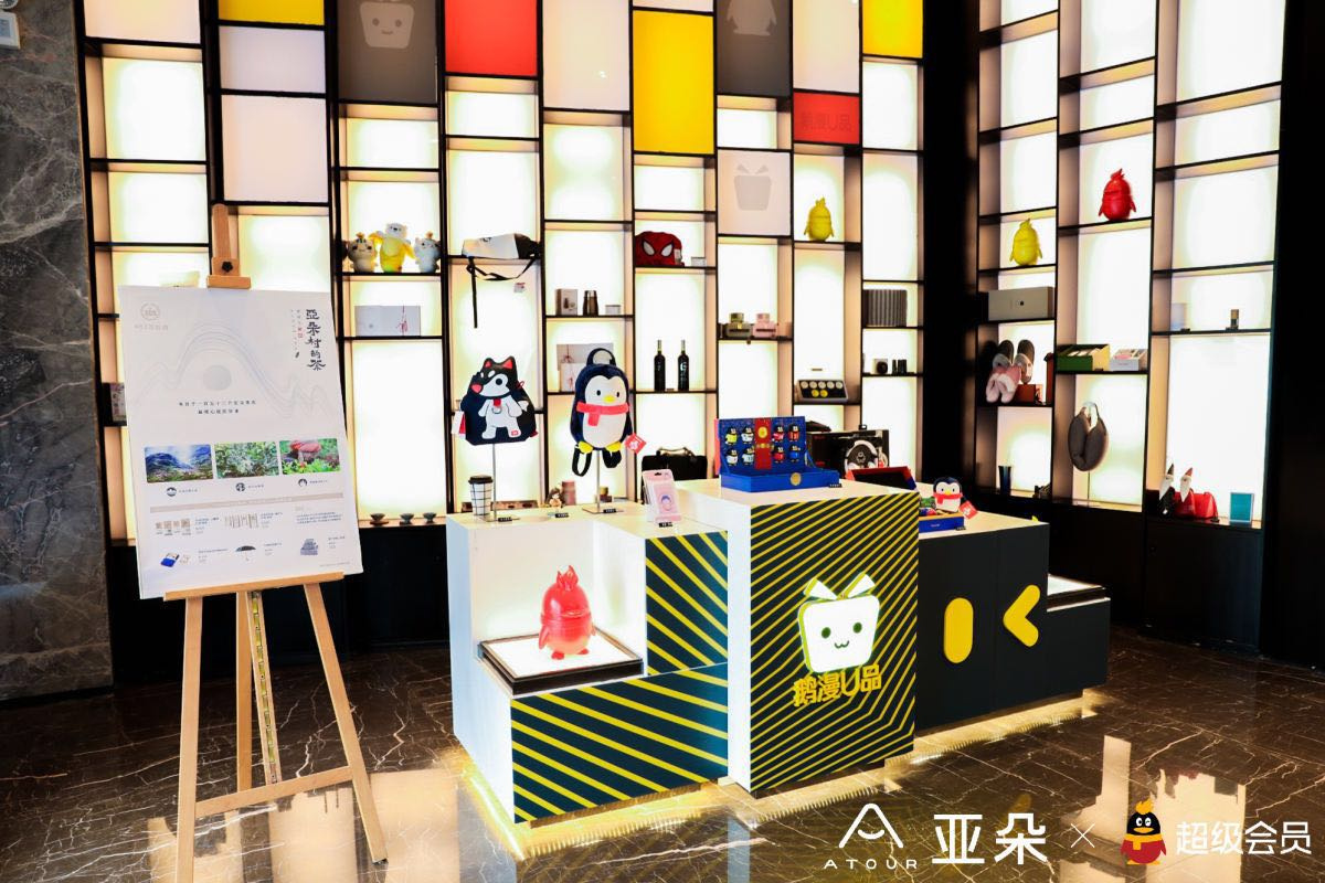 酒店的大厅错落有致地散落着小金毛雕塑。门口陈列区有鹅漫U品,王者荣耀的手办、QQ耳机、小公仔、亚朵的茶、U型枕、旅行收纳包等。
