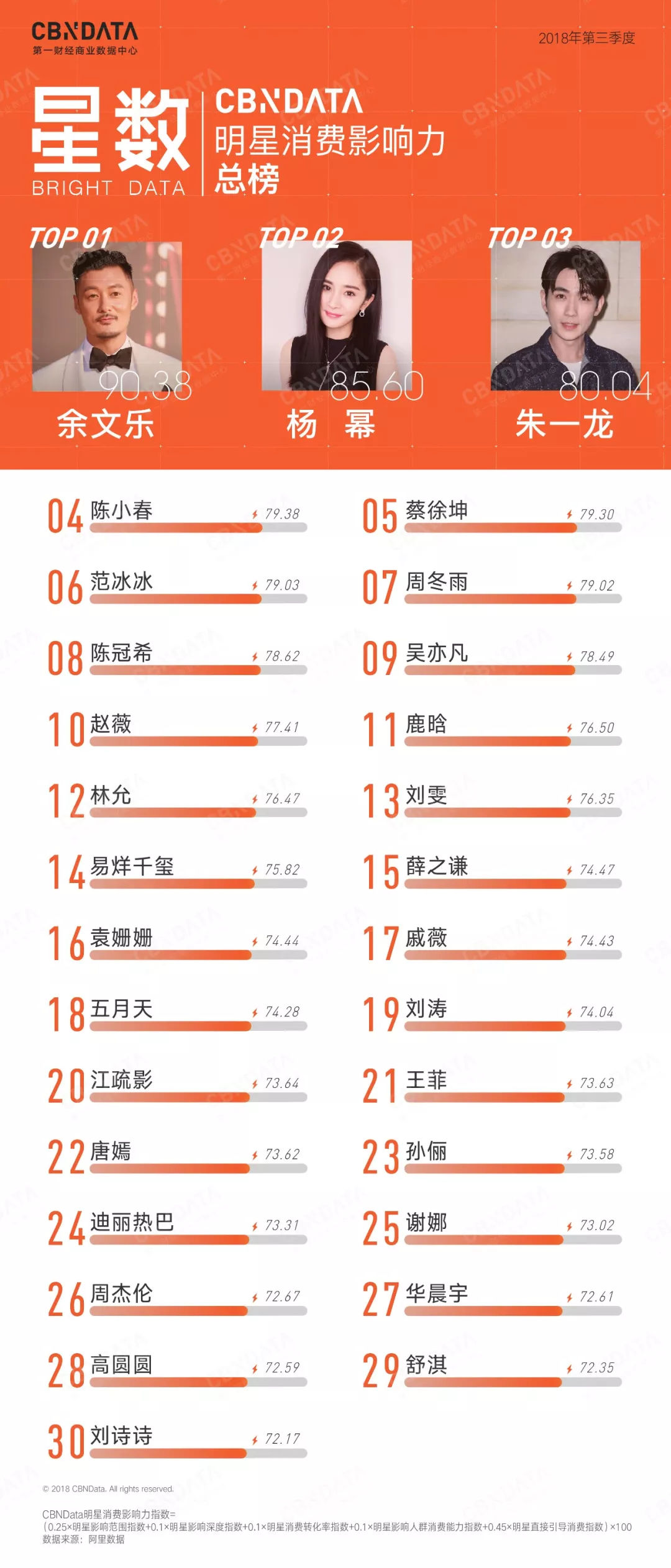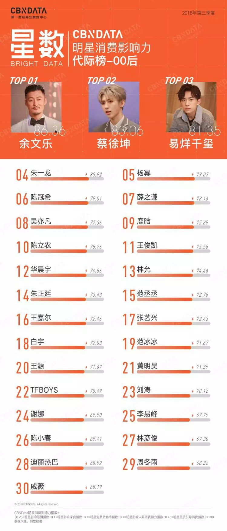 而这几位自然也不止在95后消费群中颇具影响力,更是在CBNData明星消费影响力总榜中遥遥领先,尤其是易烊千玺和蔡徐坤,这两位凭借台上台下的强反差人设,而圈粉力一再升级,以最近一期CBNData发布的三季度CBNData明星消费影响力总榜来看,分列NO.14和NO.5的俩人,已然成为当上炙手可热的影响力人物。