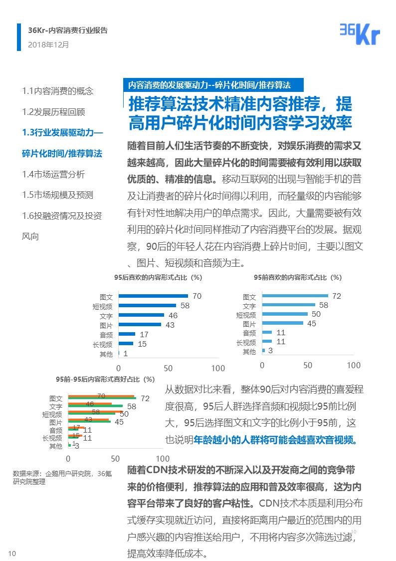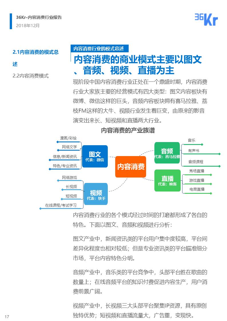 内容消费的主要形态有图文、音频和视频三种形式,其中视频包括长短视频和直播。早期内容消费的主要载体为图片、文字,近几年随着移动互联网的快速发展,短视频、音频逐渐崛起。