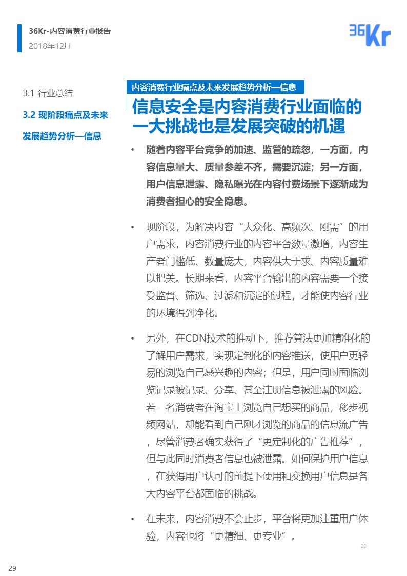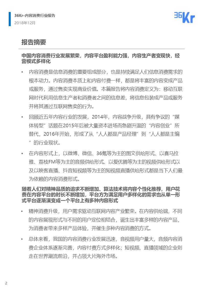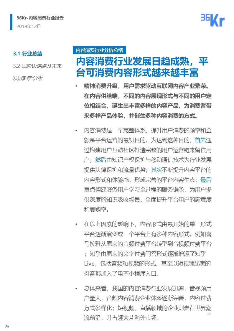 总体来看,我国的内容消费行业发展迅速,音视频用户量大,音频内容消费企业体系逐渐完善,内容付费方式多样化;短视频、直播领域的企业则走在世界潮流前沿,并占领大片海外市场。