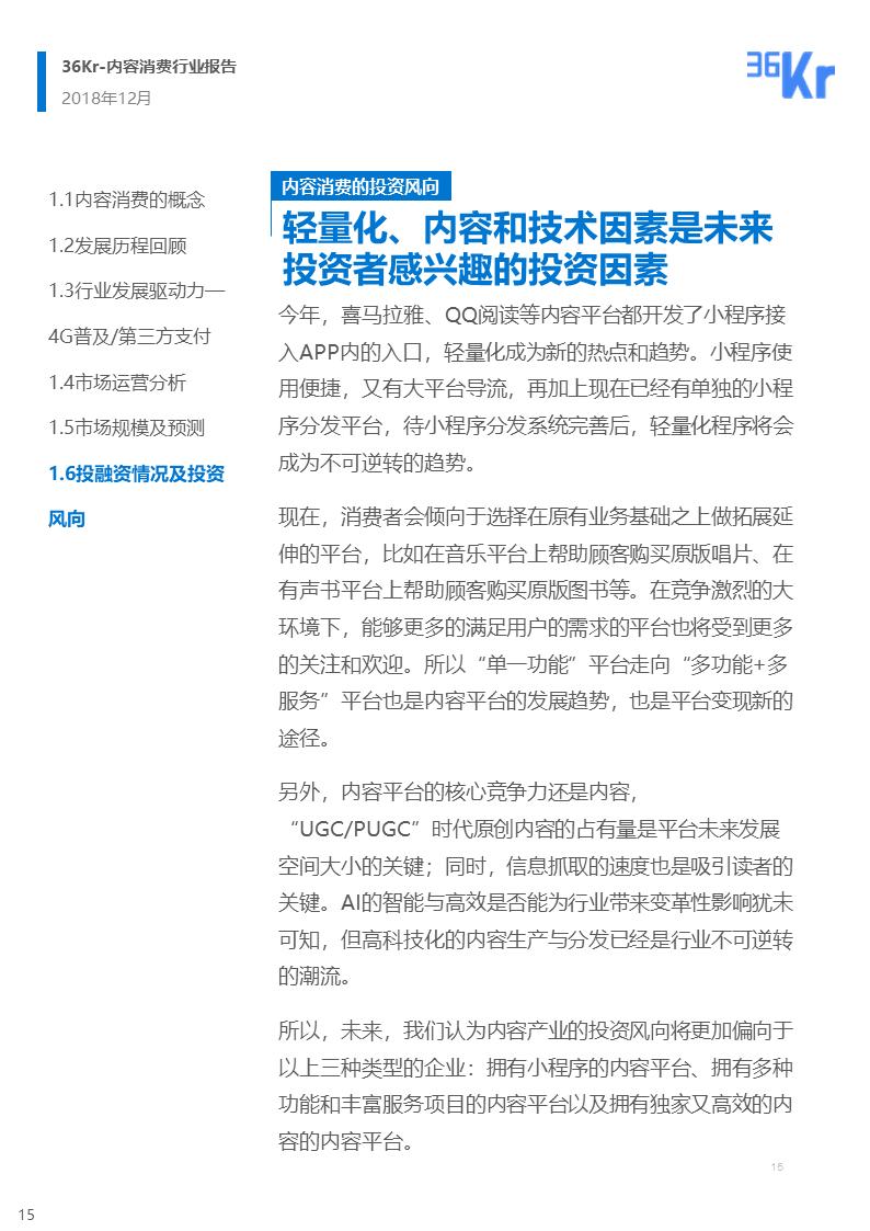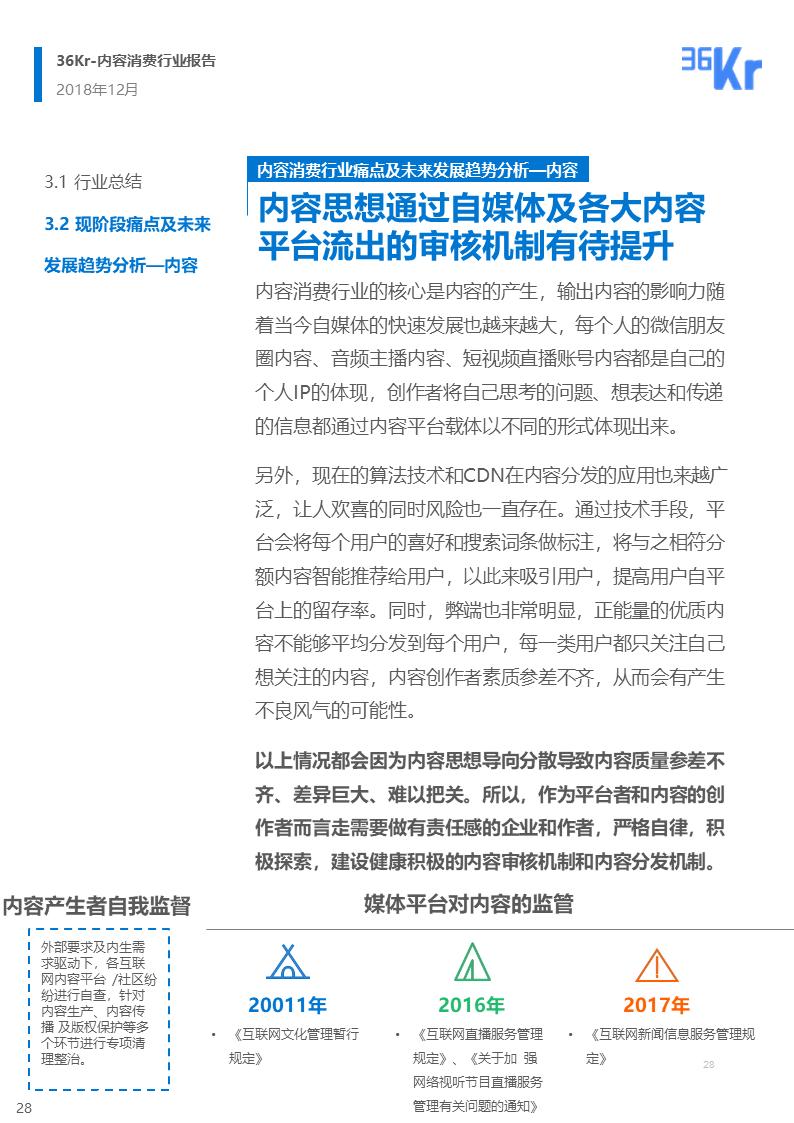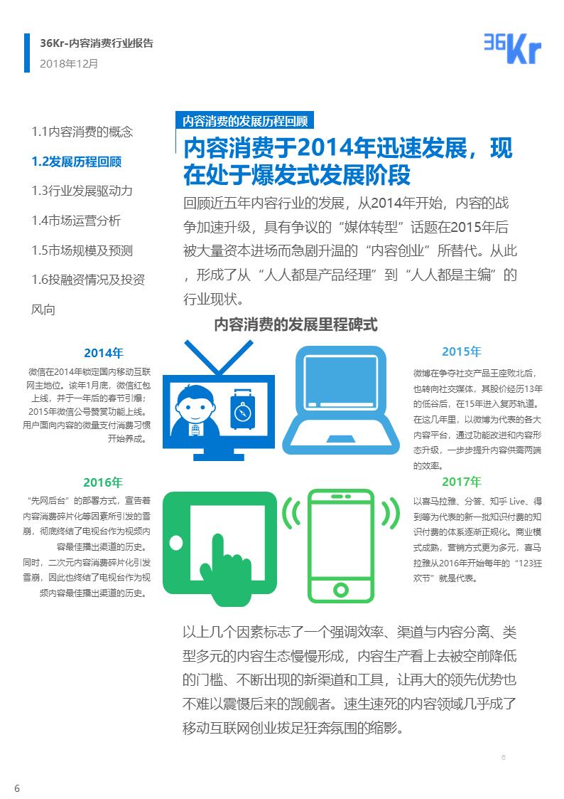 内容消费开始较早,但是真正的爆发式增长是开始于2014年,“内容创业”兴起,逐渐形成了从“人人都是产品经理”到“人人都是主编”的行业现状。内容平台的崛起,创造了新的渠道和工具,标志着一个强调效率、渠道与内容分离、类型多元的内容生态慢慢形成,内容生产和内容变现也被空前降低的门槛。