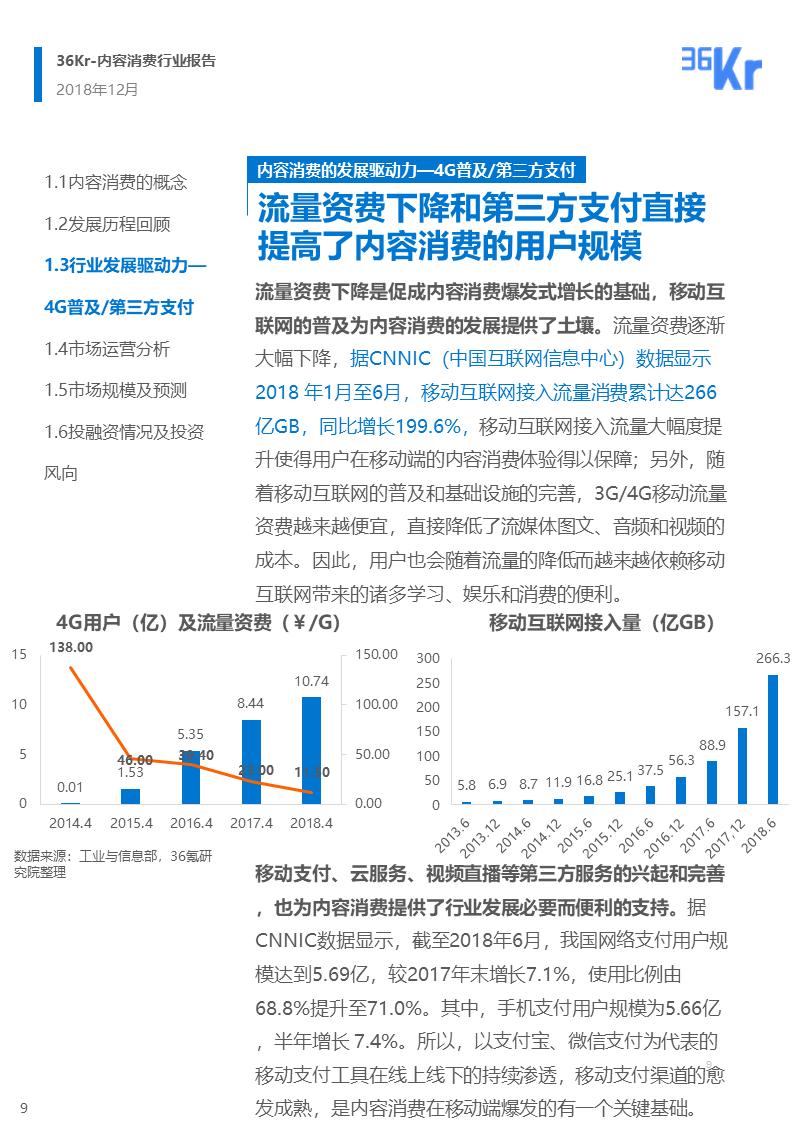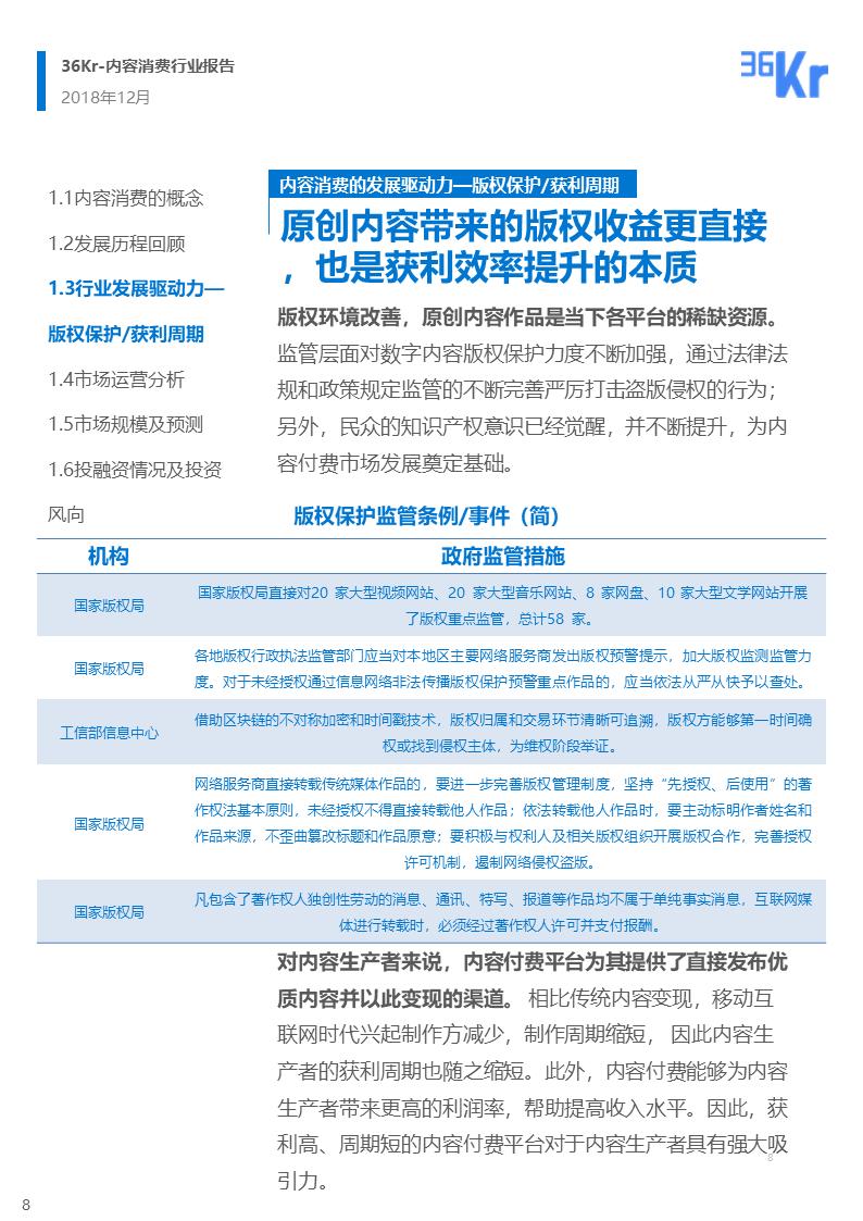 内容消费行业现阶段发展势头较好,几个主要驱动力起关键作用。人均消费水平和文化娱乐支出的额度和增速不断增加,是内容消费行业发展的强大助推力;原创内容带来的版权收益更直接,也是获利效率提升的本质,国家出台版权保护政策是对内容创作者的大力支持;内容付费平台为内容生产者提供了直接发布优质内容并以此变现的渠道,获利高、周期短的内容付费平台对于内容生产者具有强大吸引力;流量资费下降和第三方支付直接提高了内容消费的用户规模;推荐算法技术精准内容推荐,提高用户碎片化时间内容学习效率。