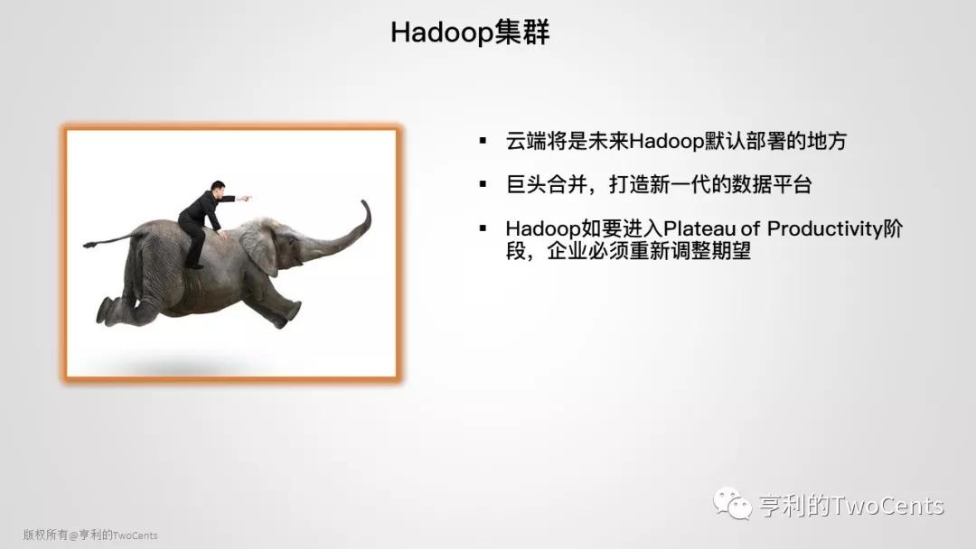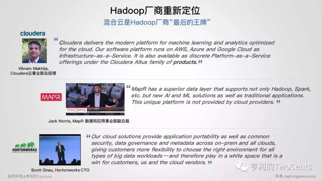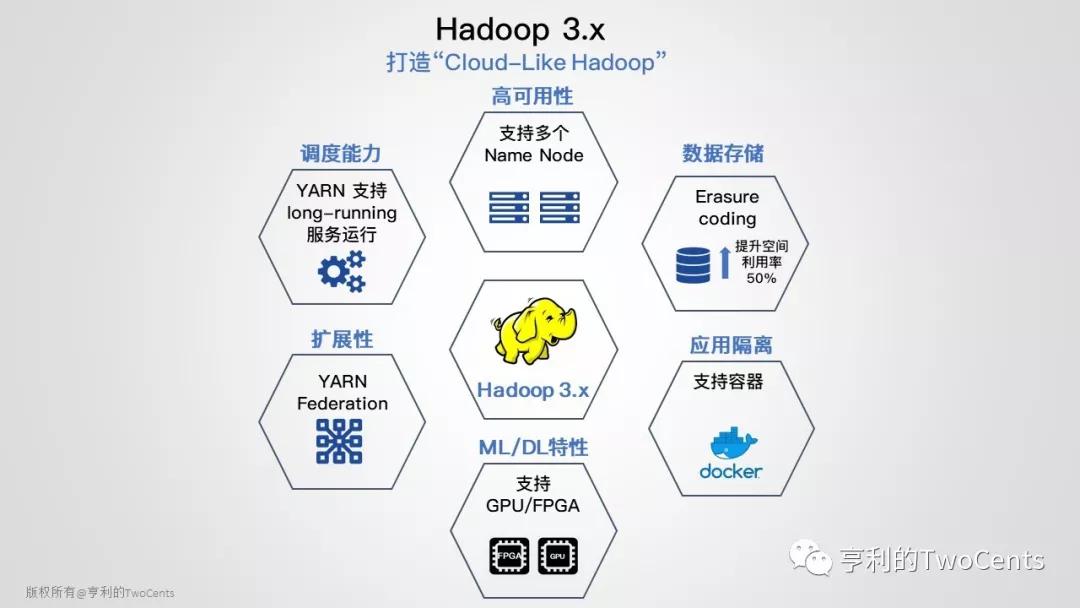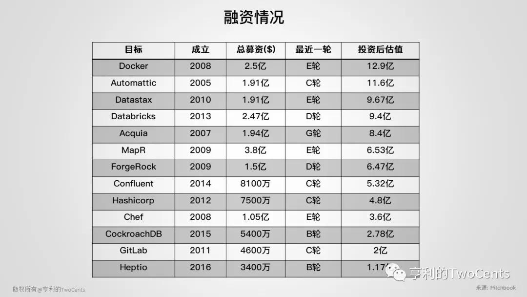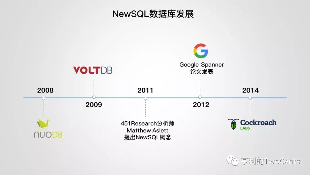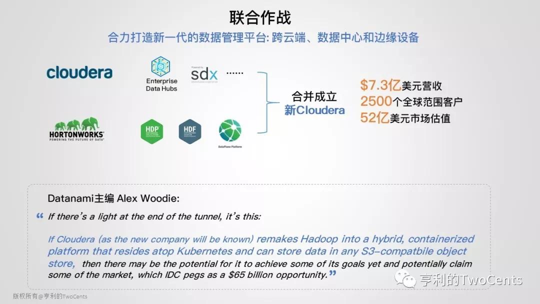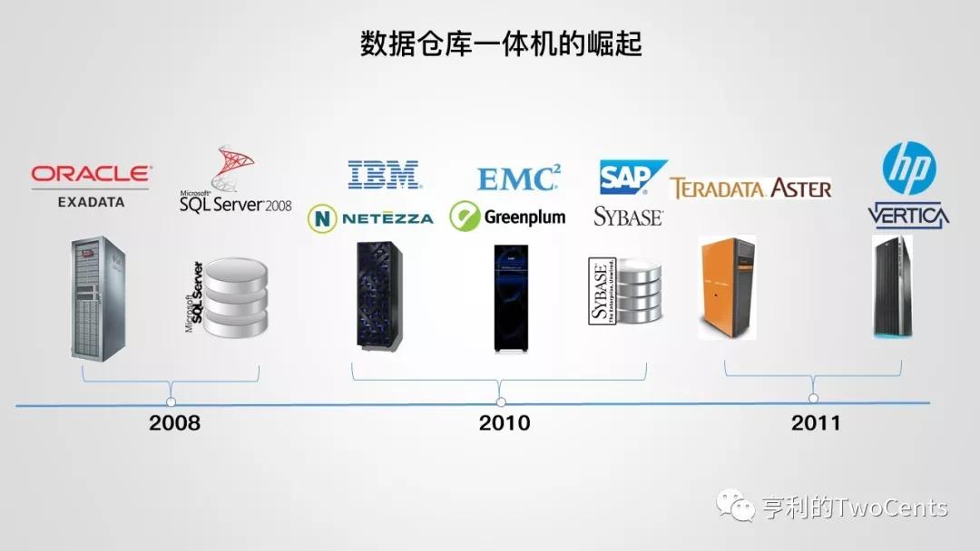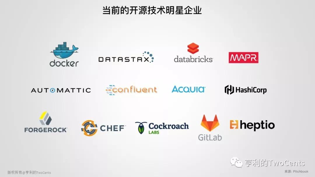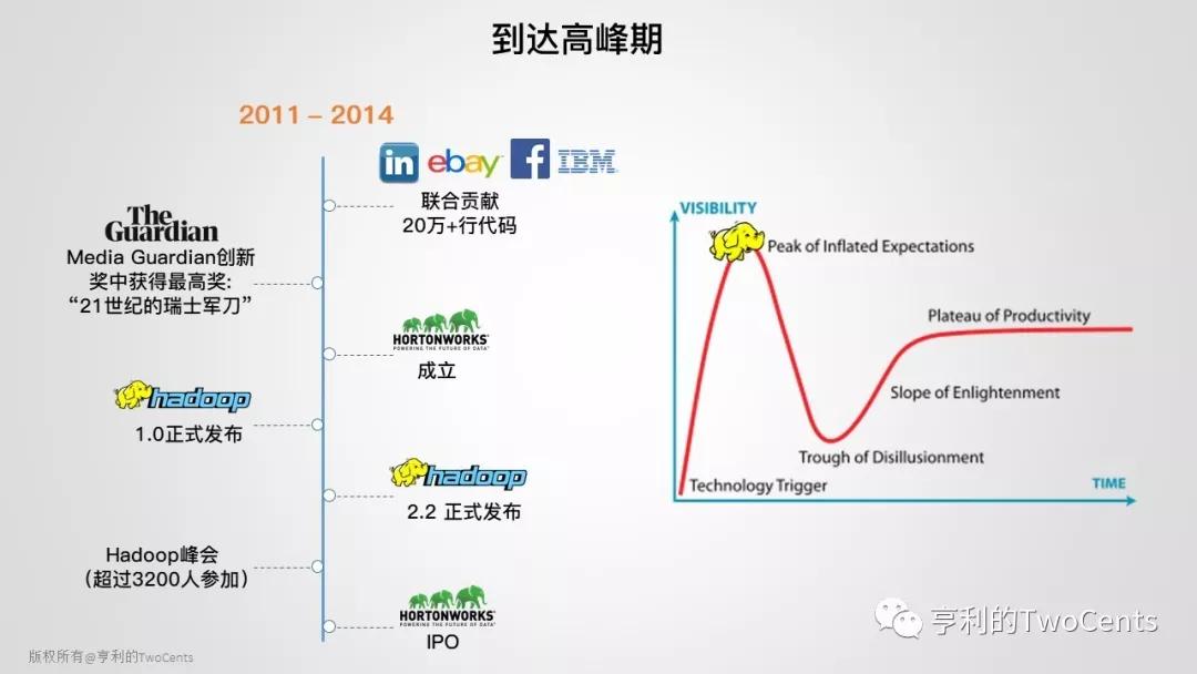 2011年,451 Research分析师Matthew Aslett首次提出NewSQL概念。2012年,Red Hat首次达到10亿美元的年收入。2013年,Docker的崛起意味容器时代的开始。2014年, 随着Hadoop三驾马车之一的Hortonworks IPO,Hadoop到达高峰时期,但在同年Hadoop保持的记录被Spark打破。2015年,Google开源Tensorflow,Kubernetes 1.0发布并捐给CNCF组织。2017年, Hadoop 3.0正式发布。2018年,Cloudera和Hortonworks两大巨头合并,Elastic IPO,市值49亿美元。