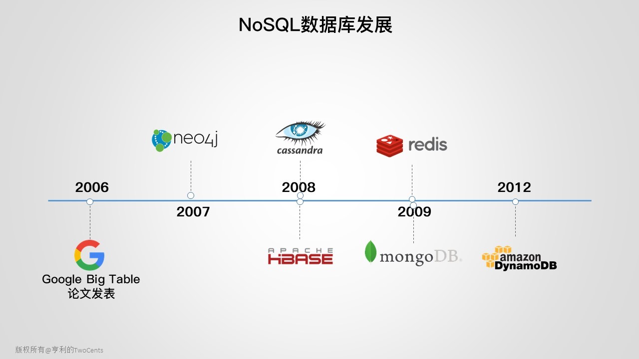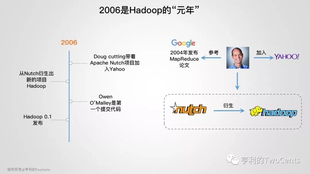 2003-2004年Google发布的GFS和MapReduce论文,对业界的影响可谓意义深远,它全面揭开了大数据的时代序幕。2006年,Doug Cutting加入Yahoo并发布Hadoop 0.1版本,同年Google发布BigTable论文。2008年,MySQL 10亿美元被Sun收购。2009年,Spark从Berkeley大学的AMPLab实验室诞生,程序员Johan Oskarsson举办第一个NoSQL数据库活动。2010年,RackSpace与NASA联合发起OpenStack云计算项目。