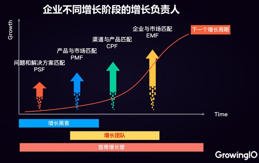 而对于企业来说,根据自身发展的不同阶段和不同层次的需求,都需要有相应层次的团队来配合。例如在产品完成之前的PSF时期,我们需要了解的主要是客户的痛点在哪里,我们需要针对这些问题去做拜访和调研;而到了产品与市场匹配的PMF阶段,我们要研究用户黏性产生的原因,强化我们的优势;当产品进一步发展到CPF和EMF的阶段时,我们需要对获客那么多的渠道进行分析和追踪,我们需要有一部分人研究我们用户从注册到下载,再到第一次用户体验流程,也需要一部分人帮助我们把一些流失的用户拉回来,需要一个内部有分工的团队来玩成这一系列工作。