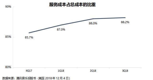 由于服务成本占总成本的比重继续上升(详见图表5),营收增速下降,第二、第三季度腾讯音乐毛利率持续下降。2018年第三季度,腾讯音乐毛利率为39.5%,低于上季度的39.9%,低于第一季度的40.9%。