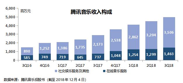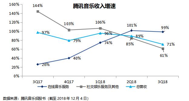 根据腾讯音乐最新公布的招股书,2018年第三季度TME总营收达到49.7亿元,同比增长71%,环比增长10%。对比第一、二季度同比增速96%、89%,总营收增速继续下降。其中,在线音乐服务收入同比增长99%,环比增长13%,至14.6亿元;社交娱乐及其他业务收入同比增长61%,环比增长9%,至35.1亿元。此前36氪在《腾讯音乐未来的营收推动力是什么?》一文中指出,鉴于社交娱乐业务ARPPU(Average Revenue per Paying User)的增长仍需要时间释放,TME总营收增速很难再延续1Q18的辉煌成就,3Q18 仍会保持在高速增长阶段(同比增速>50%)但低于二季度增速89%。腾讯音乐三季度的表现恰恰印证了之前的猜想。