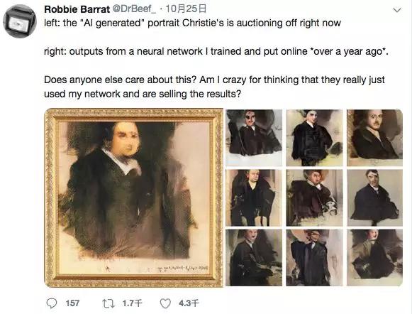 实际上,在这幅 Edmond Belamy 被拍卖后,就有一位 19 岁的少年 Robbie Barrat 跳了出来,他认为这幅画的代码大段引用了自己在 GitHub 上开源的代码。甚至他在推特上还举例自己一年多以前运用神经网络模型训练出来的画作,跟这幅被拍卖的画进行对比。