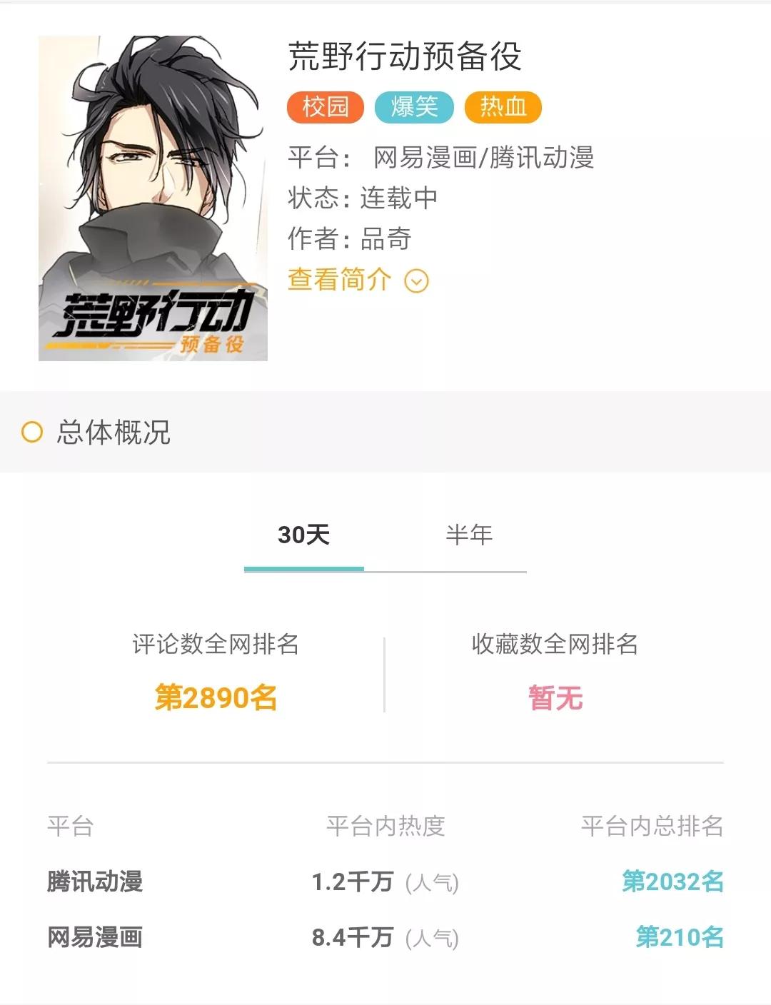 截至目前,《荒野行动预备役》更新了39话,网易漫画上点击量为8388.4万,腾讯漫画上点击量略高,人气值破亿,达到1.2亿。排名方面,该作在腾讯动漫平台内位列第2803名,在网易平台内总排名为225名。