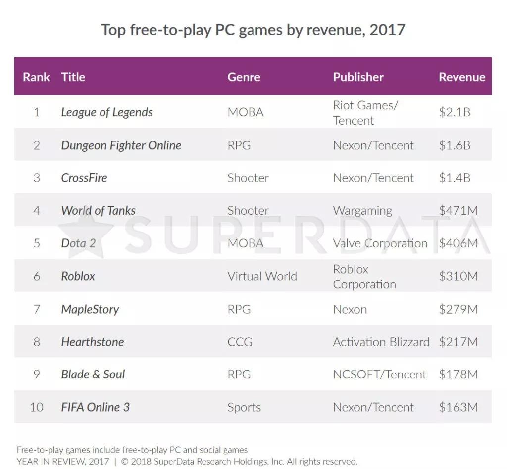 SuperData发布的2017年游戏市场收入规模数据报告显示,2017年在PC平台游戏营收TOP3分别为《英雄联盟》、《地下城与勇士》、《穿越火线》。其中《英雄联盟》2017年年营收为21亿美元。