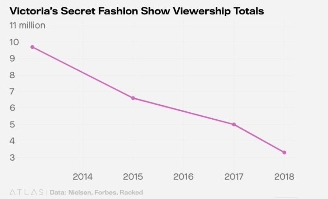 ▲维密秀近年来的收视一路下滑. 图片来自:Quartz