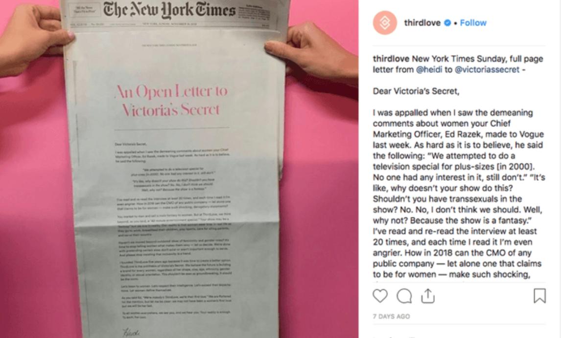 而去年兴起的 #MeToo 运动又加速了女性意识的觉醒,在这种背景下维密秀主打的性感牌甚至被认为有物化女性的嫌疑,在维密首席营销官 Ed Razek 的争议言论发表后,美国互联网内衣品牌 ThirdLove 在《纽约时报》上用了一整版来回应: