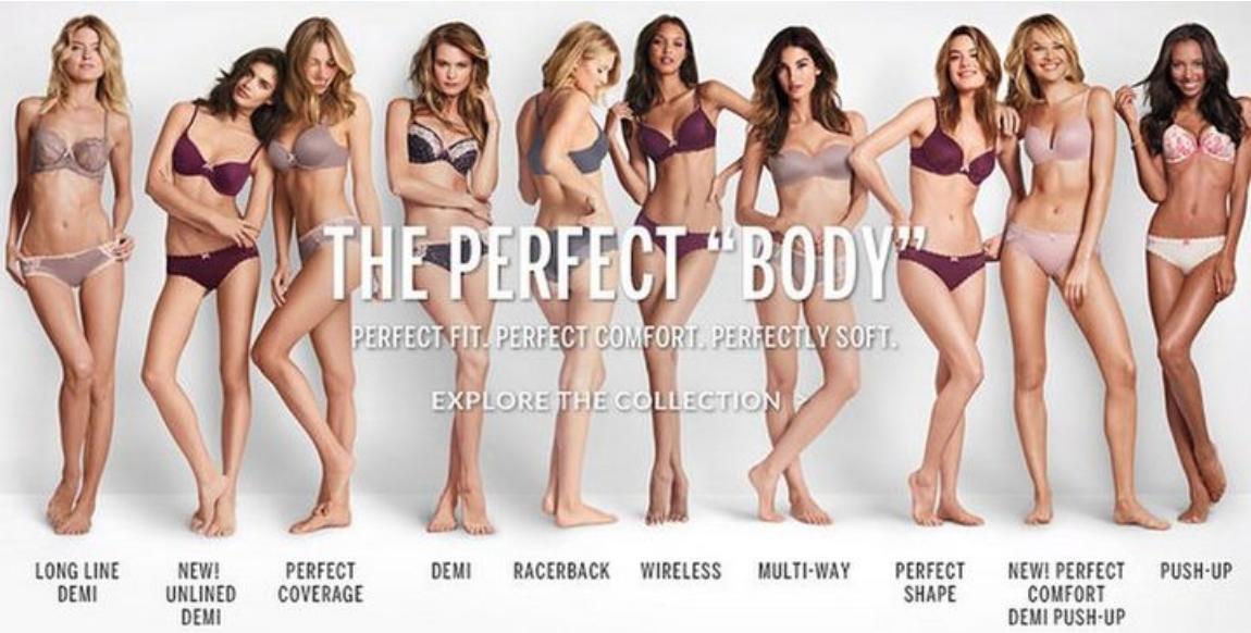 2014 年,维密曾发布一则平面广告,10 名身材火辣的模特穿着维密内衣一字排开,画面正中有一行醒目的标语—— 「The Perfect Body」(完美身材)。