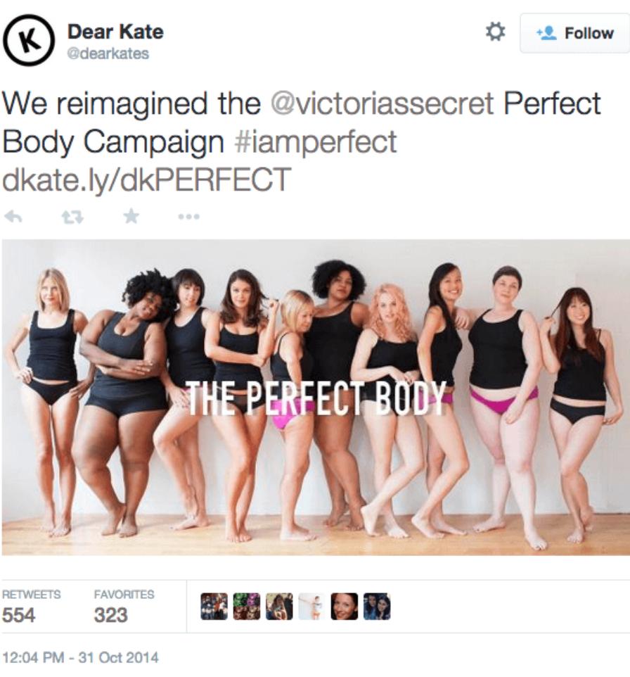 这则广告遭到了大批网友口诛笔伐,英国超过 16000 人在网上参与对维密的联名抵制, Twitter 上名为 #iamperfect 的话题也火了起来,用「高矮肥瘦各种身材都是完美」的主张来回击维密。