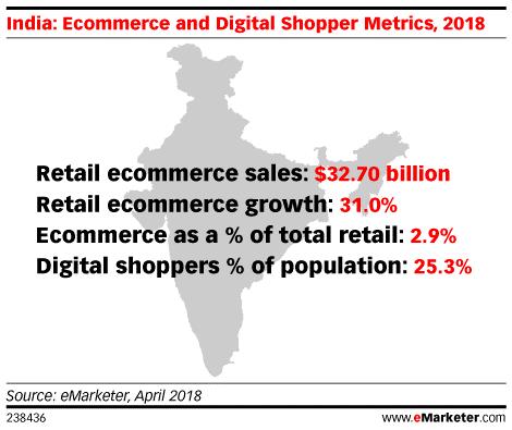 根据eMarketer的最新统计及数据显示,2018年印度的零售电子商务销售额将增长31.0%,达到32.7亿美元。不过,即便有这样的增速,印度电商市场占国内总零售份额的比例也仅为2.9%,而数字消费人群占总人口比例则是25.3%。这也表明,在现阶段电商渠道在整个印度零售体系中依然非常弱小。