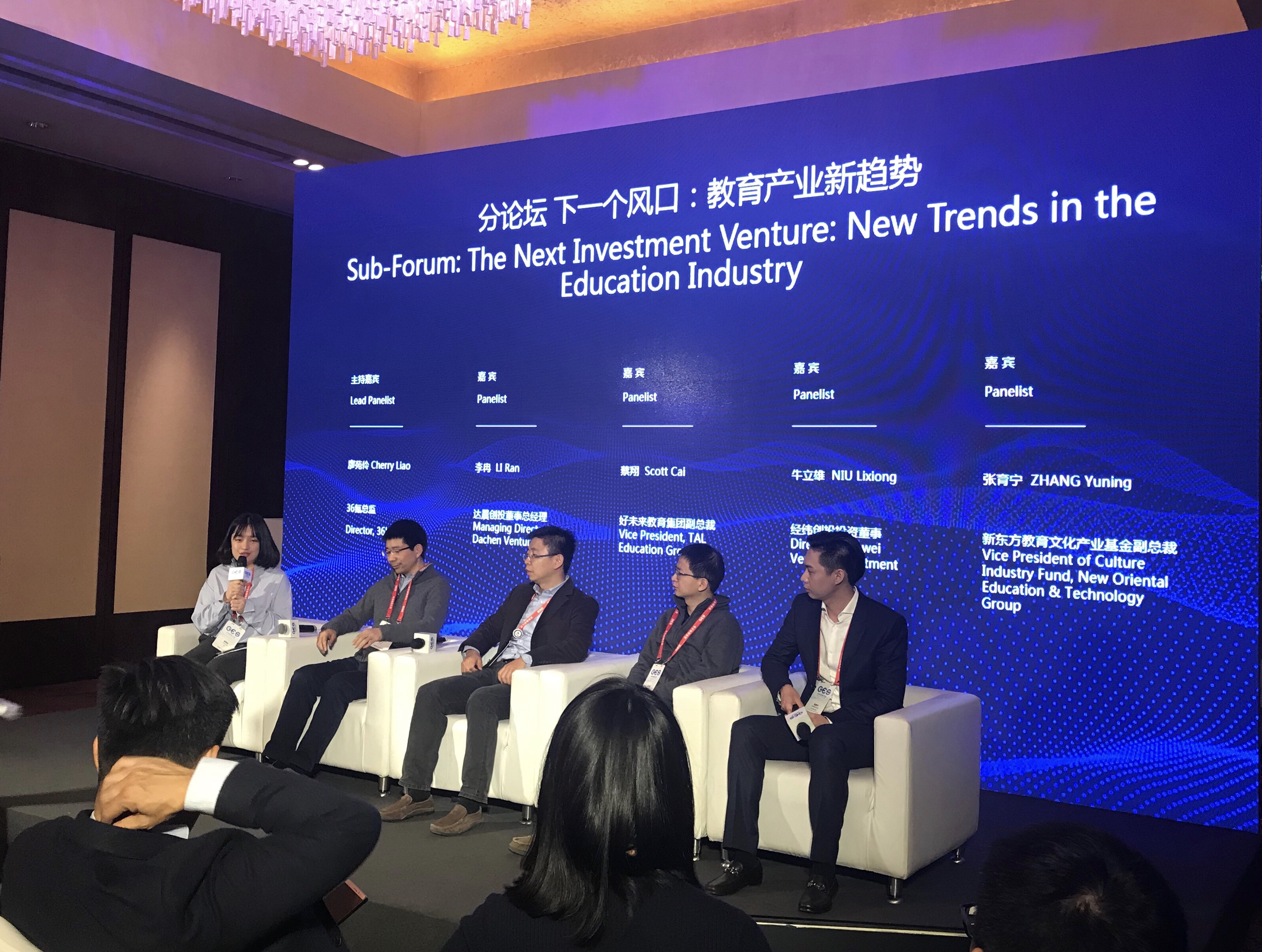 从左到右依次为:36氪未来公司部总监廖苑伶、达晨创投董事总经理李冉、好未来集团副总裁蔡翔、经纬创投投资董事牛立雄、新东方教育文化产业基金副总裁张育宁